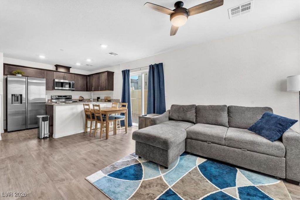 This wonderful townhome, built in 2023, offers 2 bedrooms, 2 bathrooms upstairs, a full backyard & 1-car attached garage within a smart, efficient layout, including new plantation shutters and ceiling fans, and all appliances stay with the home! Open-concept living space with granite countertops, stainless steel appliances, beautiful dark gray cabinetry, & a convenient large kitchen island. This home is truly move-in ready. The spacious primary suite and dedicated laundry area add comfort and functionality. Step outside to your private, fully fenced backyard, perfect for relaxing or entertaining. Situated on a corner lot with ample guest parking, the home is ideally located near community amenities. Watercolor is a gated community offering 3 swimming pools, a splash pad, parks, playgrounds, basketball courts, and a dog area. HOA includes high-speed internet and cable! Saving you hundreds each year. Just 25 minutes from the Las Vegas Strip, at an unbeatable price. TOUR THIS HOME TODAY!