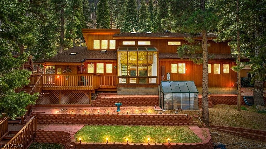 Exquisite mountain home borders USFS land with a dynamic design. Cedar siding + robust beams emit a warm, rustic charm that echoes the surrounding landscape. Bright + inviting, adorned w/large view windows that flood the interior space w/natural light. Serene sunroom provides the perfect vantage point to enjoy beautiful views of the forest + mountains. Living room w/wood-burning insert + heatilator, becomes the ideal setting for cozy evenings. Toiyabe National Forest is your extended backyard, offering unlimited exploration right at your doorstep. Experience the beauty of all four seasons from the front row seat of your home's multiple decks, whether it's the vibrant hues of fall foliage or the serene blanket of the first snowfall. Detached two-car garage w/ample storage space, massive paver driveway + parking, finished space above the garage offers endless possibilities for an office/gym/hobby room - perfectly tailored to fit your lifestyle needs. High-altitude serenity, daily.